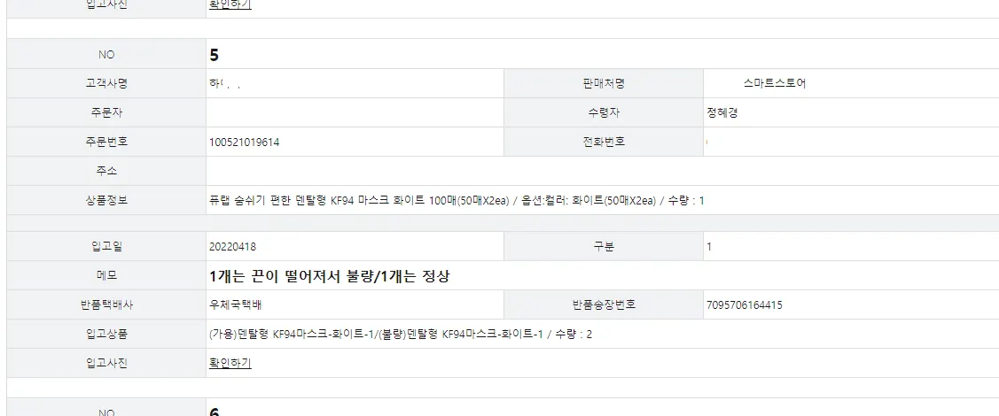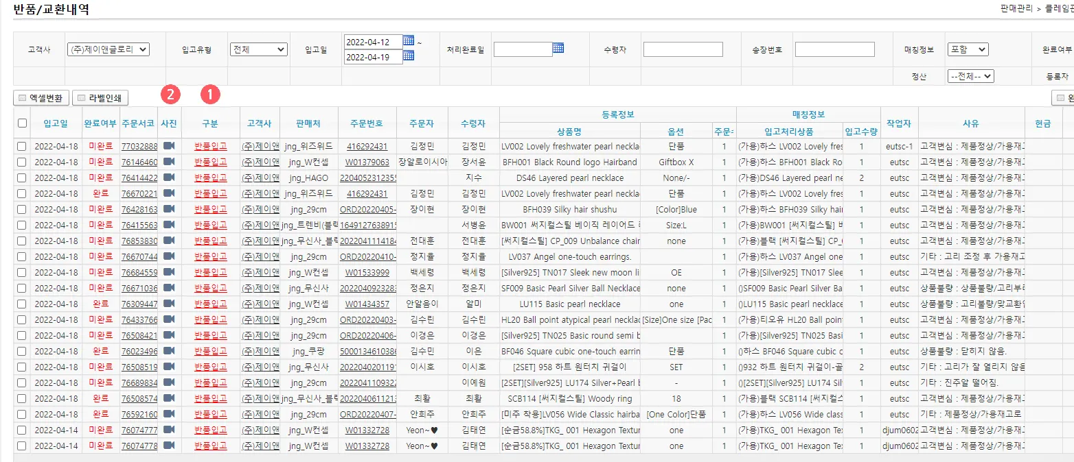 센터내 반품입고 상품은 당일확인 후 고객사에게 알림을 원칙으로 하고 있습니다. 입고된 상품의 상태를 확인 후 담당자가 내용을 입력 후 잔디메신저로 알려드립니다 클레임이 발생할 상품은 영상으로 보관하니 언제든 확인 가능합니다. 관련메뉴 판매관리 > 클레임관리 > 반품/교환내역