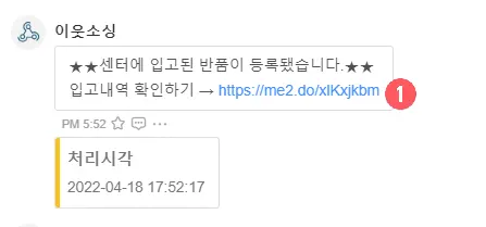 ① 반품입고 후 시스템에 등록이 되면 잔디메신저로 알림이 발송됩니다. 링크를 눌러 확인이 가능합니다.