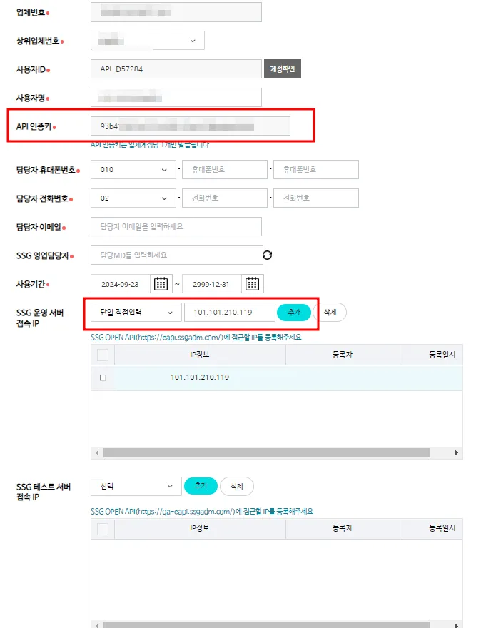 SSG운영서버 접속IP : ‘단일 직접입력’를 선택하고 아래 아이피를 추가해주세요.