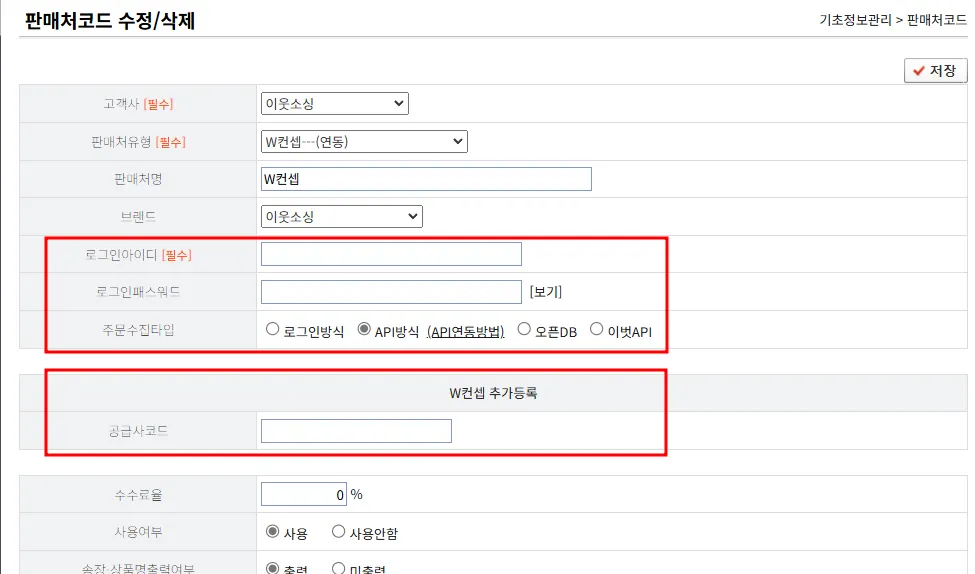 공급사코드 : 컨셉으로부터 전달받은 7자리 공급사코드를 입력합니다.