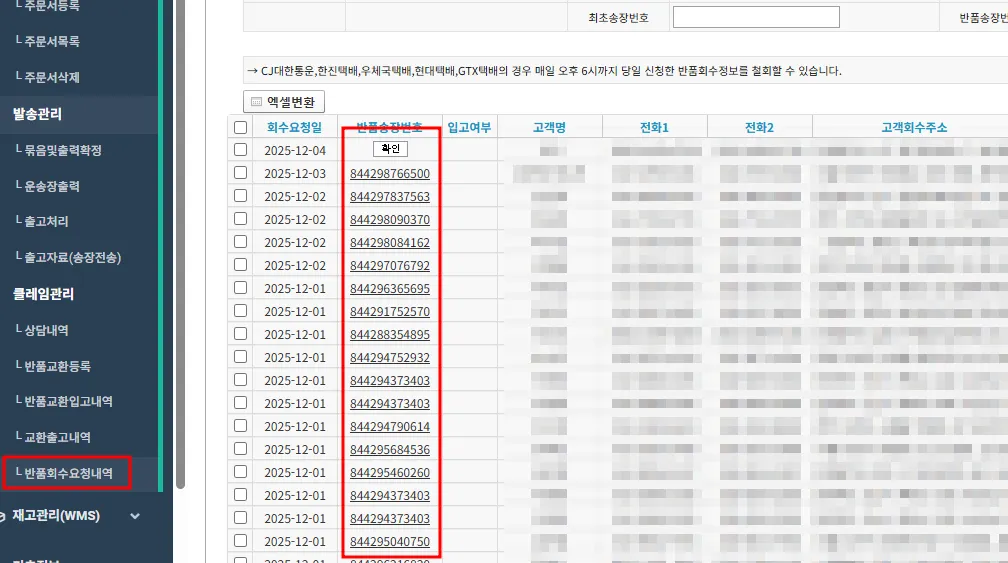 판매관리 > 클레임관리 > 반품회수요청내역 에서 택배사에서 생성한 반품송장번호를 확인할 수 있습니다.]