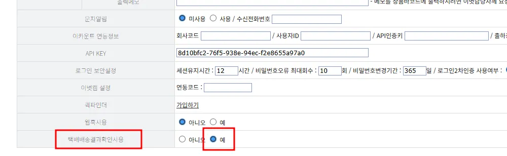 택배배송결과확인사용을 ‘예’로 체크합니다.
