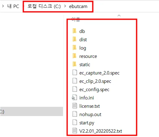 다운받은 파일의 압축을 해제한 후 C:\\ebutcam 밑에 복사합니다.