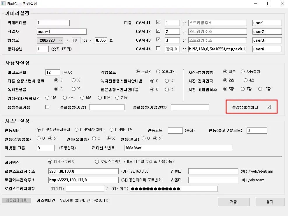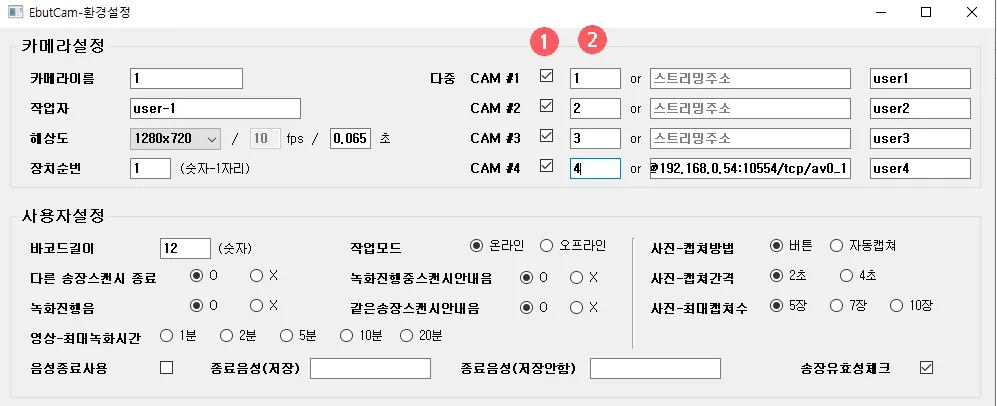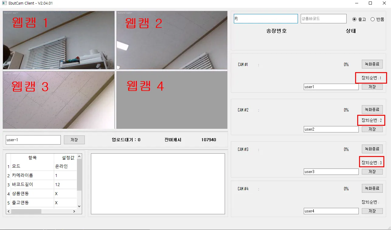 예) 1번카메라를 제어할 송장번호 스캔시 ec1송장번호 (접두어+송장번호) 조합으로 입력