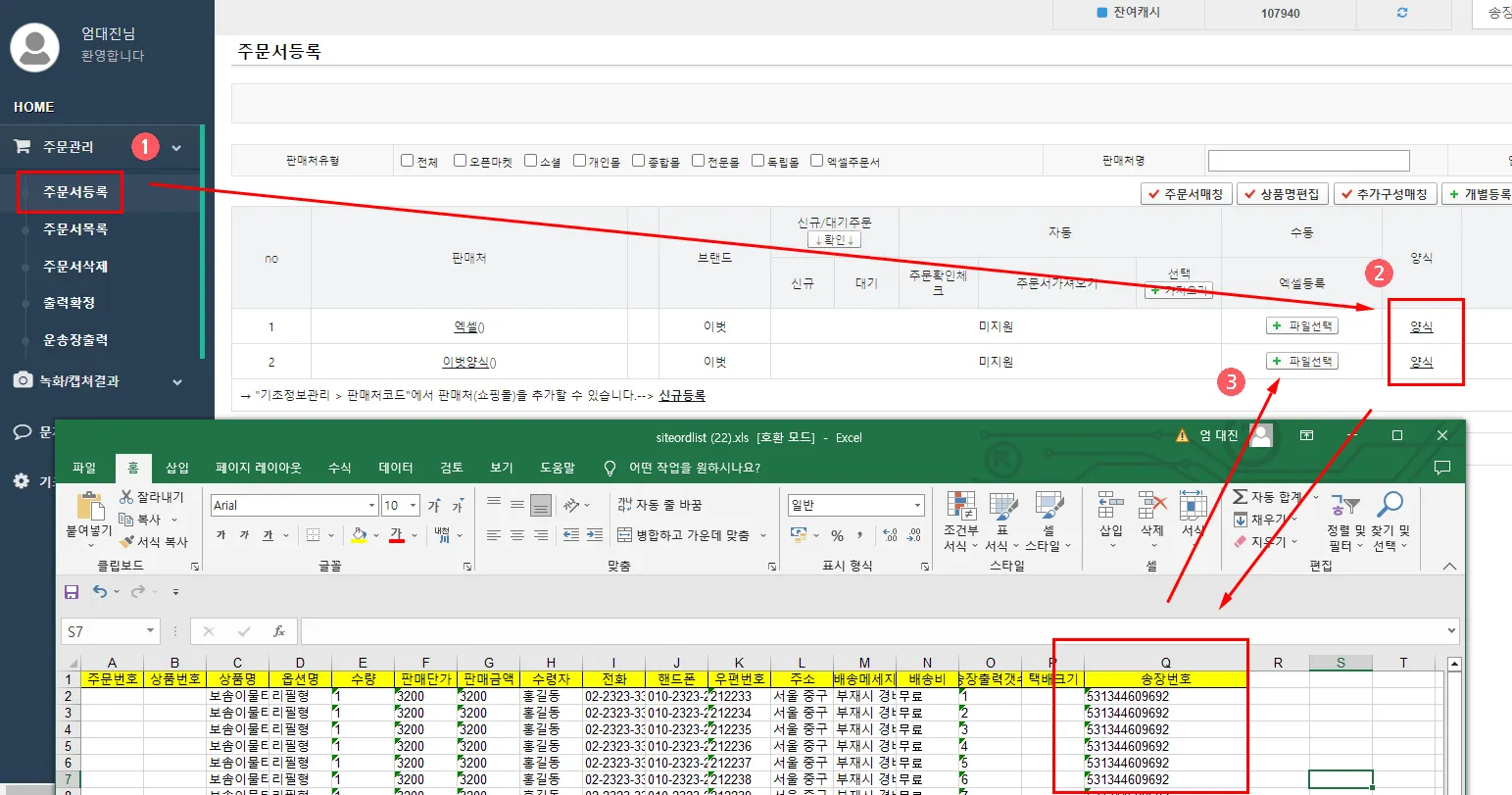 엑셀양식을 내려 받은 후 송장번호를 포함한 주문정보를 편집 후 PC에 저장하세요. (②)