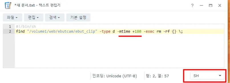 #!/bin/sh find "/volume1/web/ebutcam/ebut_clip" -type d -mtime +180 -exec rm -rf {} \; 설명 /volume1/web/ebutcam/ebut_clip : 삭제할 폴더 위치 -type d : 폴더 mtime+180 : 180일 이전 폴더