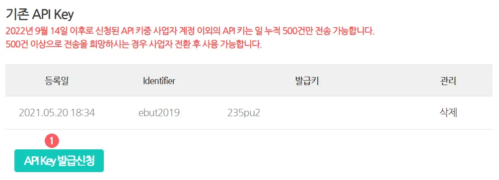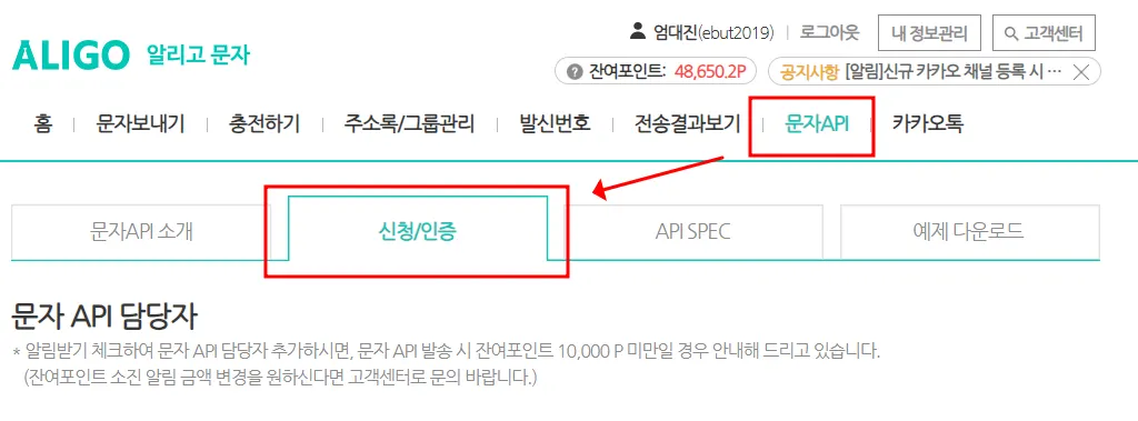 - 문자API > 신청/인증 화면으로 이동합니다.
