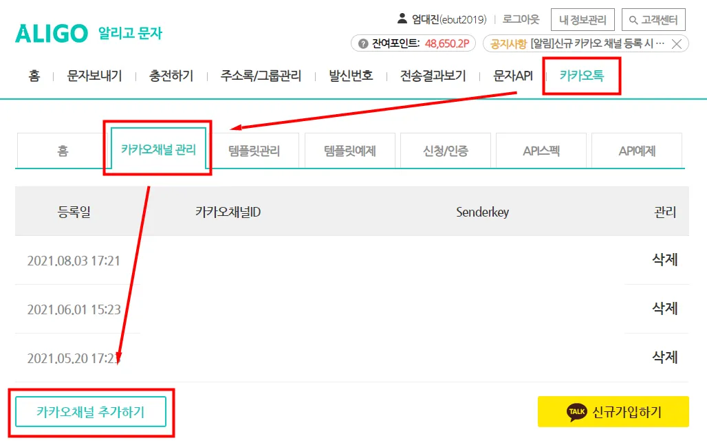 - 따라서 회원사께서는 알리고에 회원가입 후 이벗과 연동해서 사용하셔야 합니다