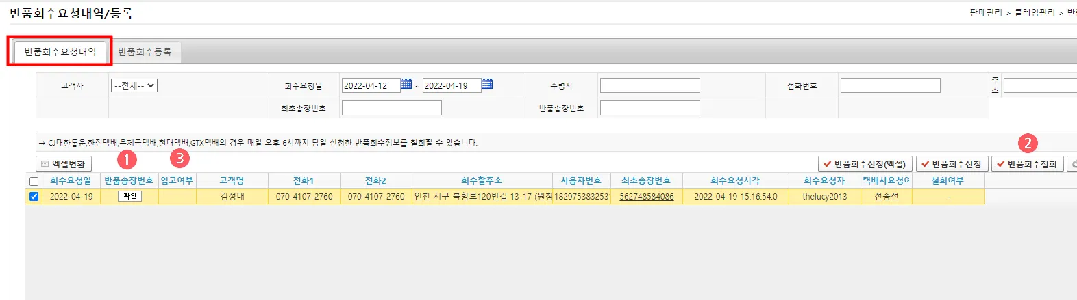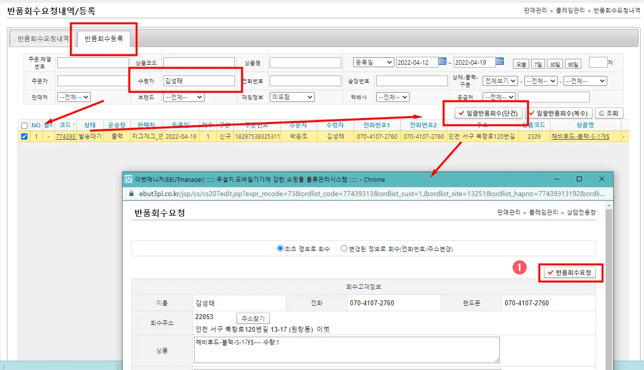 ① : 고객검색 변경사항 확인 후 마지막으로 반품회수요청버튼을 클릭하시면 됩니다.